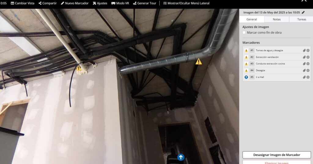 Su funcionamiento es sencillo. A través de una cámara 360º y una app móvil, se capturan imágenes que se ubican sobre plano. Desde la oficina técnica, los distintos equipos pueden visualizar qué se ha ejecutado, en qué momento y con qué resultado. Esto permite detectar desviaciones, registrar incidencias, generar alertas o informes automáticos, y construir modelos AsBuilt-gráficos con información técnica asociada.